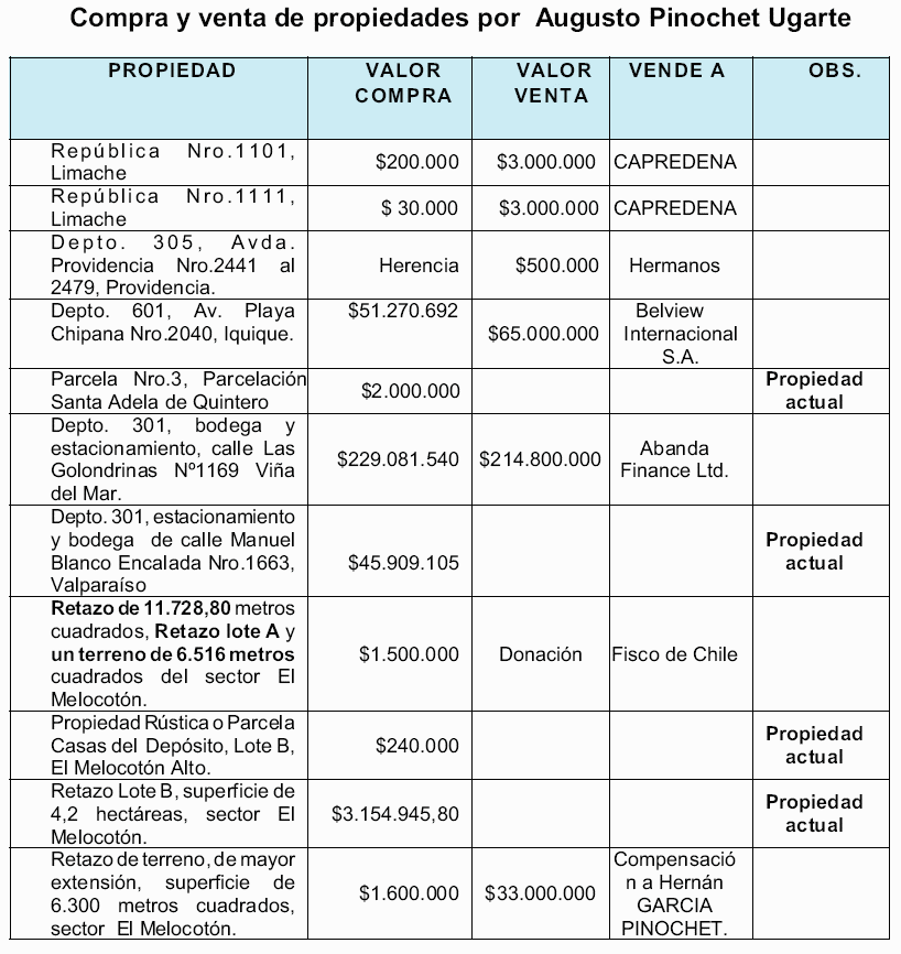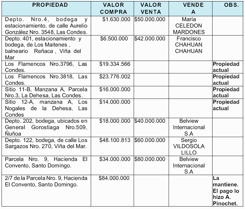 Inversiones en Chile.- Con los antecedentes recopilados, se ha constatado que Augusto José Ramón Pinochet Ugarte, como persona natural registra las siguientes operaciones de compra y venta de bienes en Chile:
