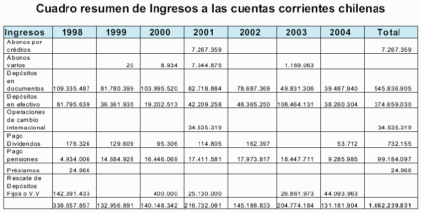 De los análisis efectuado a las cuentas corrientes Nro.000-19020-09 del Banco de Chile a nombre de la Sociedad de Inversiones Belview Internacional S.A.; Nro. 173-36708-09 mantenida en el Banco de Chile a nombre de María Lucía Hiriart Rodríguez; Nro. 0-000-40-02959-1 mantenida en el Banco Santiago, a nombre de Augusto Pinochet Ugarte; Nro.173-54201-08 mantenida en el Banco de Chile a nombre de Augusto Pinochet Ugarte y Lucía Hiriart Rodríguez; Nro. 8846387 mantenida en el Banco Boston a nombre de Augusto Pinochet Ugarte; Nro. 8541742 del Banco Boston, cuyo titular es Augusto Pinochet Ugarte; y Nro. 173-54200-10 a nombre de Augusto Pinochet Ugarte, del período 1998 al 2004, mantenidas por Augusto Pinochet, Lucía Hiriart y la Sociedad de Inversiones Belview S.A., se registraron ingresos por $1.062.239.831, cifra que incluye los dineros recibidos por sueldos, pensiones, depósitos por venta de propiedades y en efectivo de actos no identificados e ingresos provenientes del extranjero, depósitos del cambio de cheques del Banco Riggs, entre otros. Asimismo, se registran en estas cuentas traspasos a las cuentas de una mujer (Mónica Ananías Kuncar) y Jacqueline Pinochet Hiriart, además de otras personas.