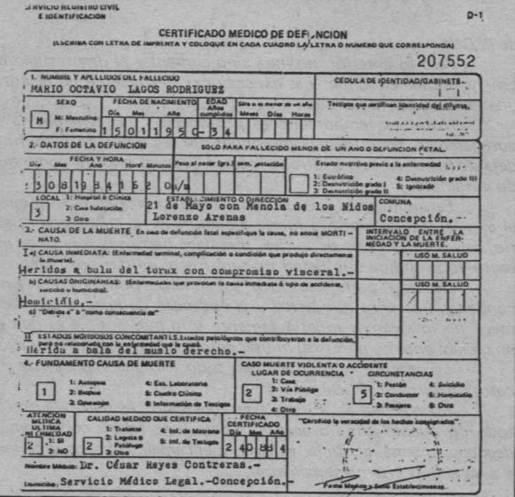 Los protocolos de autopsia y los certificados médicos de defunción (1) coinciden en señalar como causa de muerte de Luciano Aedo, Mario Lagos y Nelson Herrera, heridas a balas producidas por armas homicidas. Nelson Herrera y Mario Lagos fueron asesinados en plena luz del día frente a la Vega Monumental ante cientos de testigos. El chofer del taxibús donde viajaban relató que ellos fueron asesinados y que no hubo enfrentamiento de ningún tipo. Todos estos antecedentes constan en el expediente Nº 745- 84. Sin embargo el fiscal Ad-Hoc Pedro Marisio no ha dictado ninguna resolución que afecte a los homicidas.