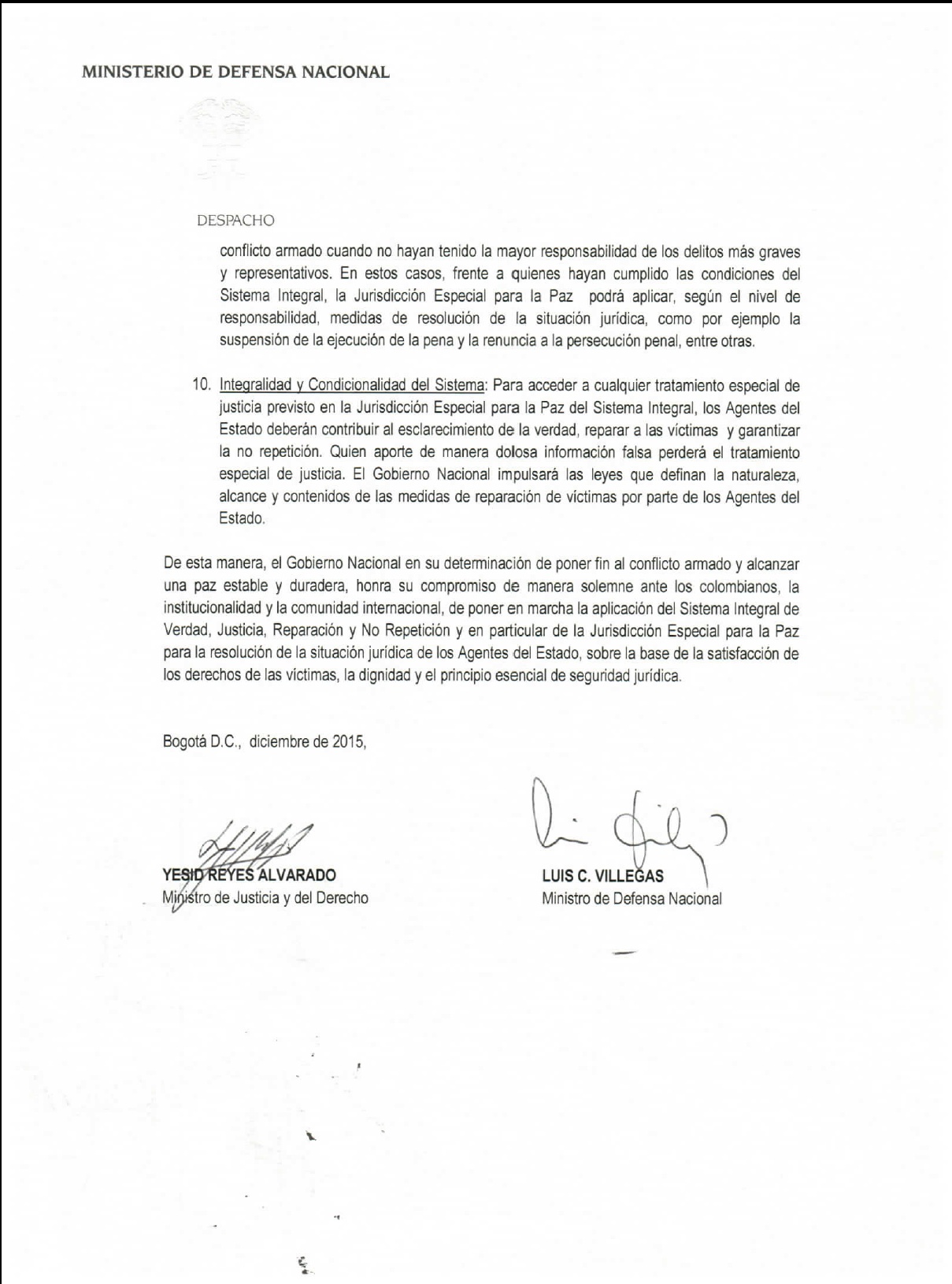 El Gobierno Nacional y los colombianos reconocemos el sacrificio y la entrega que durante décadas han demostrado las Fuerzas Militares, la Policía Nacional y en general los Agentes del Estado, en la búsqueda permanente para garantizar la protección de todos los colombianos. El Estado reconoce que en el desarrollo del conflicto se han cometido violaciones a los derechos humanos e infracciones al DIH.