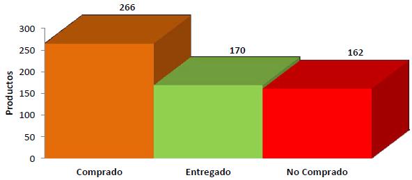 El datos más destacable dentro de este gráfico, es la barra roja, la cual muestra que 162 medicamentos no fueron comprados, lo que significa que no ingresarán al almacén del hospital. La razón por la que no se compraron fue que, 93 de estos no fueron programados por el HE y 69 no se obtuvieron a través de la licitación que realizó la Secretaría de Salud.