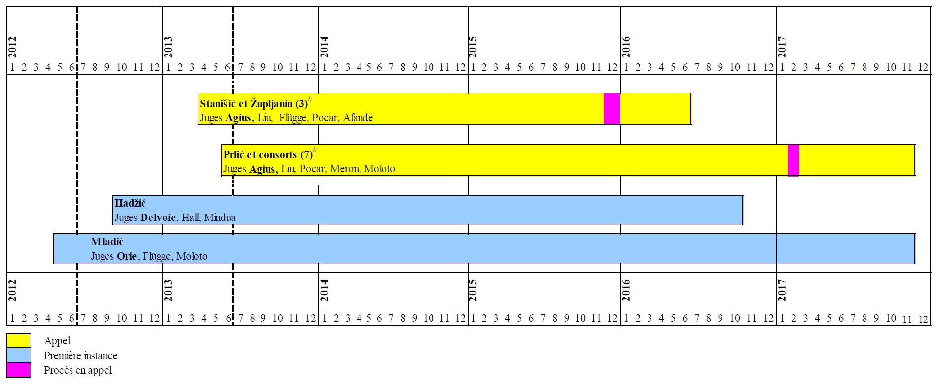 Nom Anciennes fonctions Comparution initiale Début du procès Ratko Mladić Commandant de l'état-major principal de l'armée des Serbes de Bosnie 3 juin 2011 Procès ouvert le 16 mai 2012 Goran Hadžić Président, Région autonome serbe de la Slavonie, de la Baranja et du Srem occidental 25 juillet 2011 Procès ouvert le 16 octobre 2012 B. Accusés jugés en appel au 17 mai 2016 (par accusé)