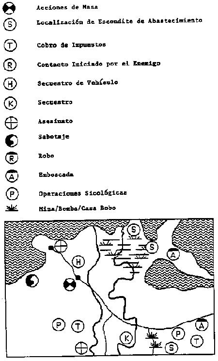 A pesar de que los insurgentes por lo general no siguen una doctrina rígida al igual que un ejército convencional, todo los esfuerzos tienen que hacerse para identificar los patrones de actividad, operaciones y táctica5 que diferencian al enemigo. Las tácticas de guerrilla son usualmente caracterizadas por operaciones en pequeña escala que son llevadas acabo sobre una área extensa, técnicas de ataque y huida, y retirada y dispersión en vez de defensa del terreno. El guerrillero tiene las mismas capacidades de ataque, defensa, retirada y reenfuerzo que cualquier otro enemigo, se debe de considerar que toda la información e inteligencia del enemigo es implementadas después de una consideración profunda de las condiciones únicas de este tipo de conflicto. Como la información relacionada con la ubicación y dispositivos de las fuerzas de guerrilla enemigas solo tiene un tiempo limitado de utilidad, .1 analista debe indicar las horas en que las anoto. Los calcos de situación deben hacerse periódicamente, basándose en el mapa de situación; deben retenerse por un tiempo para luego compararlos unos con otros a fin de tratar de descubrir algún "Patrón o dirección de movimiento de las guerrillas, los puntos de terminación o los cambios de dirección, como también las horas del dfa cuando ocurren normalmente los movimientos y cambios de dispositivos.