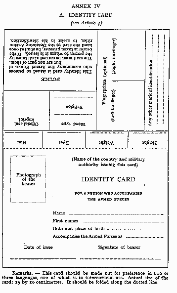 Each Party to a conflict is required to furnish the persons under its jurisdiction who are liable to become prisoners of war, with an identity card showing the owner's surname, first names, rank, army, regimental, personal or serial number or equivalent information, and date of birth. The identity card may, furthermore, bear the signature or the fingerprints, or both, of the owner, and may bear, as well, any other information the Party to the conflict may wish to add concerning persons belonging to its armed forces. As far as possible the card shall measure 6.5 x 10 cm. and shall be issued in duplicate. The identity card shall be shown by the prisoner of war upon demand, but may in no case be taken away from him.
